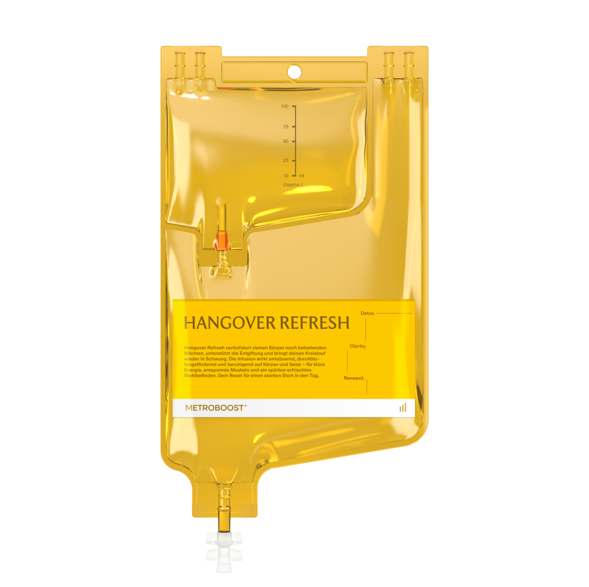 Die METROBOOST® HANGOVER REFRESH Infusion unterstützt die Regeneration nach erhöhten körperlichen oder mentalen Belastungen und fördert das allgemeine Wohlbefinden: